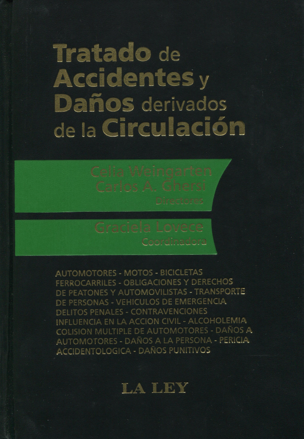 Tratado de accidentes de tránsito y daños derivados de la circulación : automotores- motos-bicicletas-ferrocarriles-obligaciones y derechos de peatones y automovilistas- transporte de personas- vehículos de emergencia : delitos penales-contravenciones : influencia en la acción civil- alcoholemia-colisión múltiple de automotores- daños a la persona- pericia accidentológica- daños punitivos : anexos legislación y jurisprudencia.